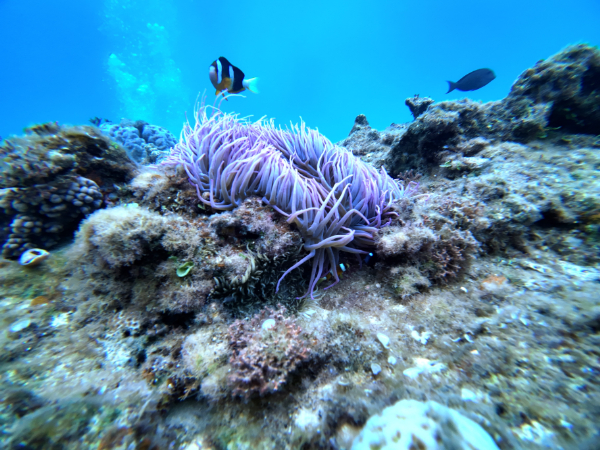 根の上には、各種クマノミがいます。見やすいのは、クマノミ、ハマクマノミ。小さなハナビラクマノミもいますよ。