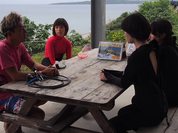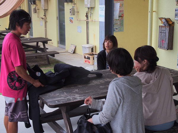 まずは入る前のウェットスーツのサイズ合わせからブリーフィング!